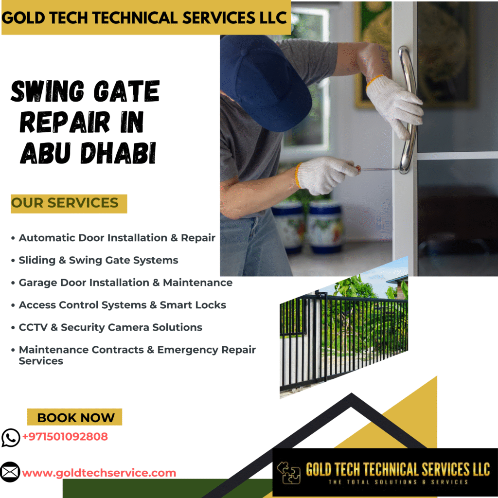 Swing Gate Repair in Abu Dhabi is a vital service for anyone seeking reliable security and smooth operation of their property’s entrance. With GOLD TECH TECHNICAL SERVICES LLC, you can rest assured that your swing gate will be repaired with precision, using top-quality materials and expert techniques. From minor adjustments to major mechanical fixes, our dedicated team ensures your gate remains safe, functional, and visually appealing. Contact us today and experience the difference professional service can make for your property.