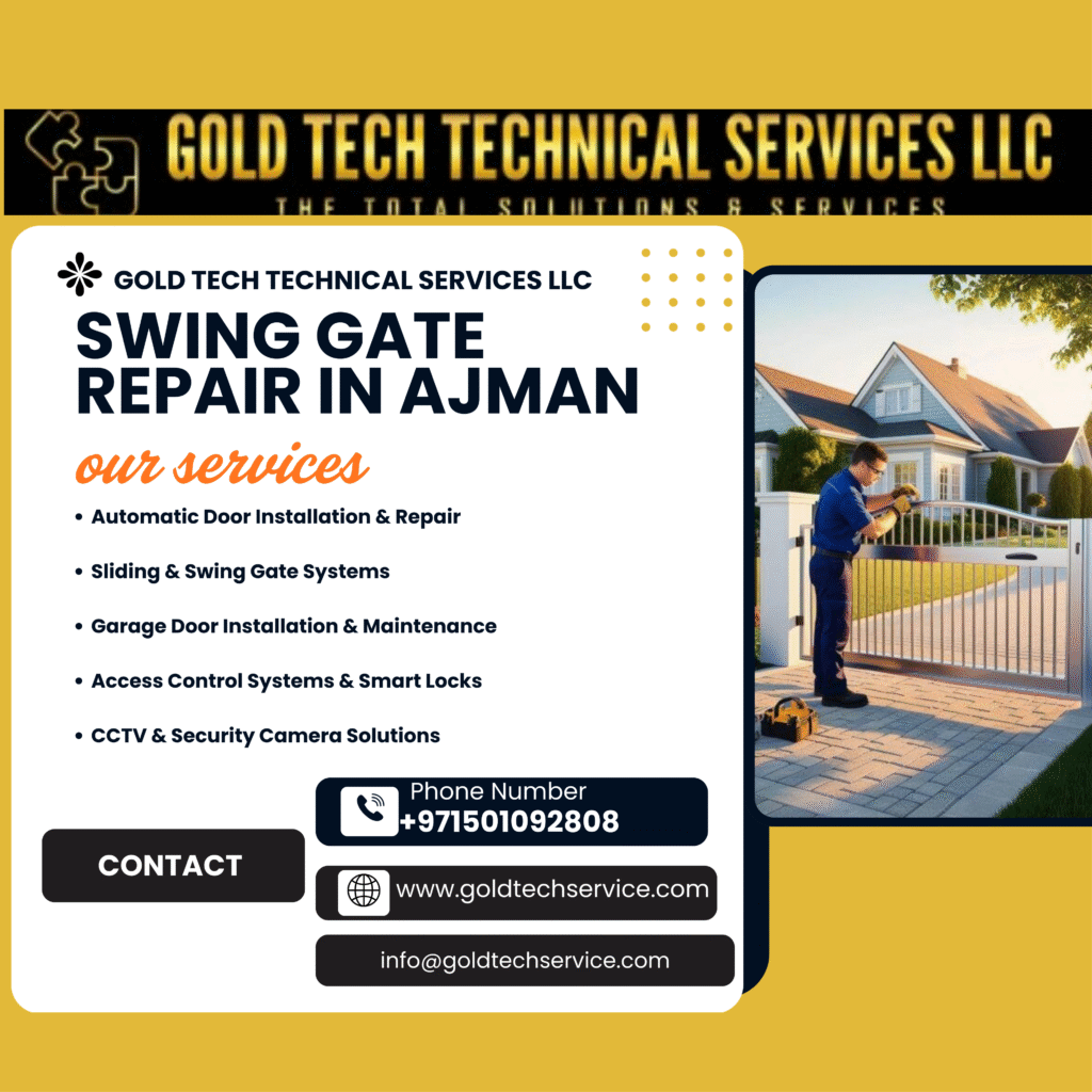 Swing Gate Repair in Ajman is an essential service for homeowners and businesses who value security, convenience, and functionality. Whether it’s a residential villa, commercial property, or an industrial setup, a malfunctioning swing gate can disrupt daily operations and compromise safety. At GOLD TECH TECHNICAL SERVICES LLC, we specialize in providing expert swing gate repair solutions in Ajman and surrounding areas, ensuring that your gate remains strong, smooth, and fully operational.